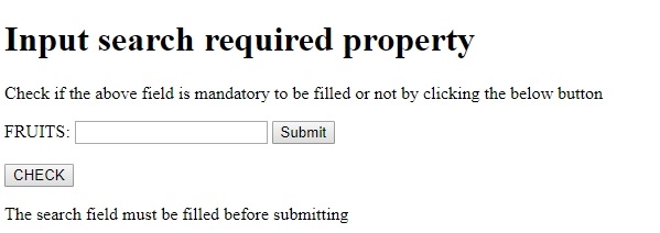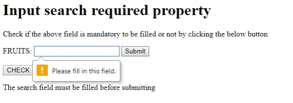 HTML DOM 輸入搜尋所需的屬性與 <input> 元素的 required 特性相關聯。required 特性用於設定和返回在將表單提交給伺服器之前填充某些搜尋欄位是否必要。這將允許使用者放空具有 required 特性的搜尋欄位後不提交表單。