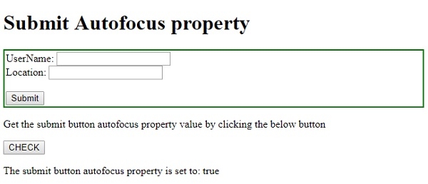 <p>Get the submit button autofocus property value by clicking the below button</p>