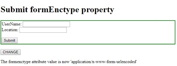 document.getElementById("Sample").innerHTML = "The formenctype attribute value is now 'application/x-www-form-urlencoded' ";