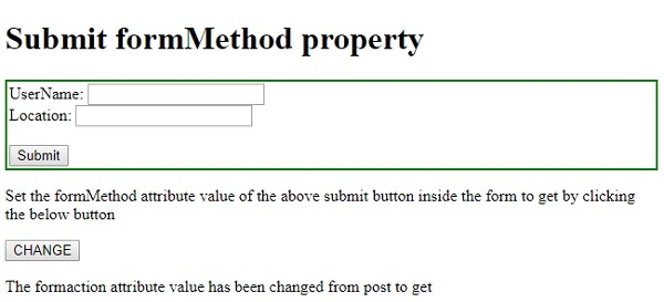 document.getElementById("Sample").innerHTML = "The formaction attribute value has been changed from post to get";