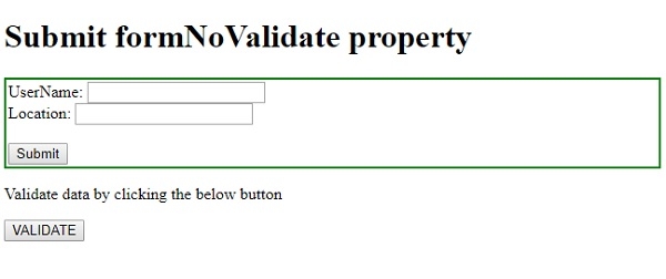 讓我們看一個輸入提交 formNoValidate 屬性的示例 −
