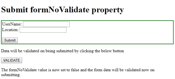 document.getElementById("Sample").innerHTML = "The formNoValidate value is now set to false and the form data will be validated now on submitting.";
