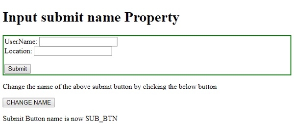 document.getElementById("Sample").innerHTML = "Submit Button name is now SUB_BTN";