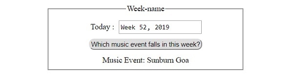 <input type="week" id="WeekSelect" value="2019-W52" name="Sunburn Goa">