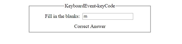 <!DOCTYPE html> <html> <head> <title>KeyboardEvent keyCode</title> <style> form { width:70%; margin: 0 auto; text-align: center; } * { padding: 2px; margin:5px; } input[type="button"] { border-radius: 10px; } </style> </head> <body> <form> <fieldset> <legend>KeyboardEvent-keyCode</legend> <label>Fill in the blanks: <input type="text" id="textSelect" placeholder="__ for Mango" onkeypress="getEventData(event)" autocomplete="off"> </label> <div id="divDisplay"></div> </fieldset> </form> <script> var divDisplay = document.getElementById("divDisplay"); var textSelect = document.getElementById("textSelect"); function getEventData(InputEvent) { if(InputEvent.keyCode === 109) divDisplay.textContent = 'Correct Answer'; else divDisplay.textContent = 'Try Again, '+textSelect.placeholder; textSelect.textContent = ''; } </script> </body> </html>