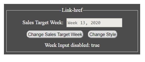 <!DOCTYPE html> <html> <head> <title>Link href</title> <link id="extStyle" rel="stylesheet" type="text/css" href="style.css"> </head> <body> <form> <fieldset> <legend>Link-href</legend> <label for="WeekSelect">Sales Target Week: <input type="week" id="WeekSelect" value="2020-W13" disabled> </label> <input type="button" onclick="enableWeekInput()" value="Change Sales Target Week"> <input type="button" onclick="changeStyle()" value="Change Style"> <div id="divDisplay"></div> </fieldset> </form> <script> var divDisplay = document.getElementById("divDisplay"); var inputWeek = document.getElementById("WeekSelect"); var extStyle = document.getElementById("extStyle"); divDisplay.textContent = 'Week Input disabled: '+inputWeek.disabled; function enableWeekInput() { inputWeek.disabled = false; divDisplay.textContent = 'Week Input disabled: '+inputWeek.disabled; } function changeStyle(){ extStyle.href = 'anotherStyle.css'; } </script> </body> </html>