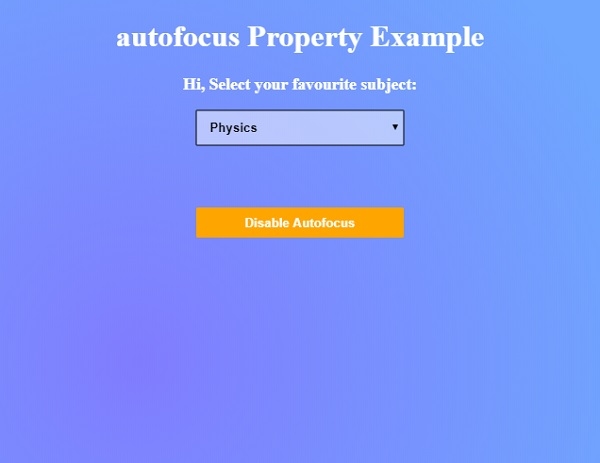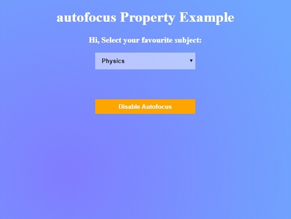 讓我們看一個 HTML DOM 選擇自動聚焦屬性的示例 -