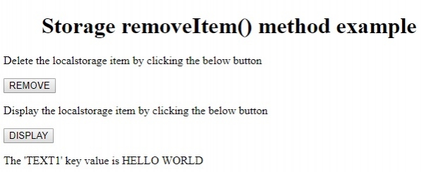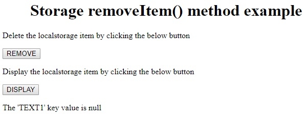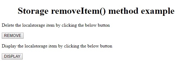<h1 style="text-align:center">Storage removeItem() method example</h1>
