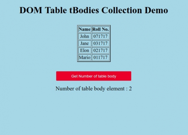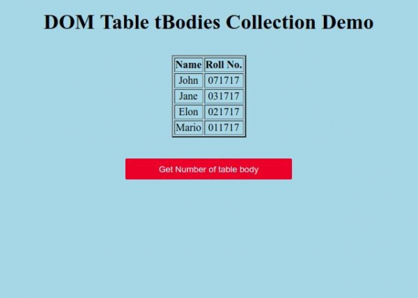 讓我們看一個 HTML DOM 表元素 tBodies 集合示例 −