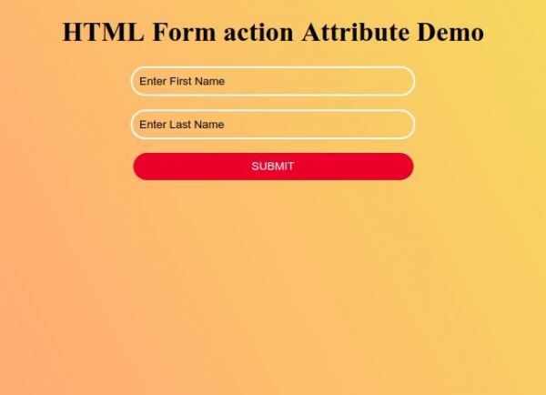 <!DOCTYPE html> <html> <style> body { color: #000; height: 100vh; background: linear-gradient(62deg, #FBAB7E 0%, #F7CE68 100%) no-repeat; text-align: center; } input { width: 315px; display: block; margin: 1rem auto; border: 2px solid #fff; padding: 8px; background: transparent; border-radius: 20px; outline: none; } ::placeholder { color: #000; } .btn { background: #db133a; border: none; height: 2rem; border-radius: 20px; width: 330px; display: block; color: #fff; outline: none; cursor: pointer; margin: 1rem auto; } </style> <body> <h1>HTML Form action Attribute Demo</h1> <form action="/action_page.php" method="get"> <input type="text" name="firstname" placeholder="Enter First Name"> <input type="text" name="lastname" placeholder="Enter Last Name"> <input type="submit" value="SUBMIT" class="btn"> </form> </body> </html>