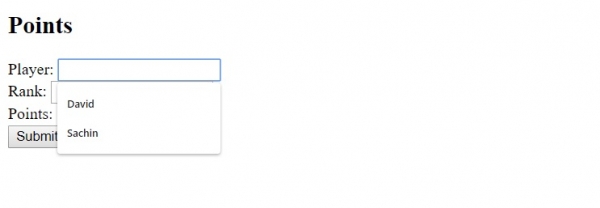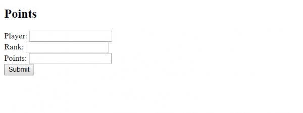 <!DOCTYPE html> <html> <body> <h2>Points</h2> <form action="" method="get" autocomplete="on"> Player: <input type="text" name="player"><br> Rank: <input type="number" name="rank"><br> Points: <input type="number" name="pts"><br> <button type="submit" value="Submit">Submit</button> </form> </body> </html>