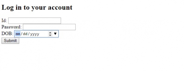 <!DOCTYPE html> <html> <body> <h2>Log in to your account</h2> <form action="" method="get"> Id: <input type="text" name="id"><br> Password: <input type="password" name="pwd"><br> DOB: <input type="date" name="dob" autofocus><br> <button type="submit" value="Submit">Submit</button> </form> </body> </html>