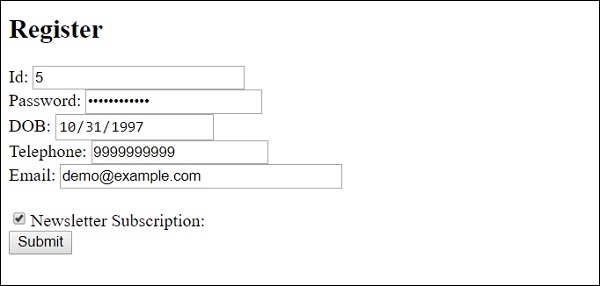 <!DOCTYPE html> <html> <body> <h2>Register</h2> <form action = "" method = "get"> Id: <input type = "text" name = "id" placeholder = "Enter UserId here..." size = "25"><br> Password: <input type = "password" name = "pwd" placeholder = "Enter password here..."><br> DOB: <input type = "date" name = "dob" placeholder = "Enter date of birth here..."><br> Telephone: <input type = "tel" name = "tel" placeholder = "Enter mobile number here..."><br> Email: <input type = "email" name = "email" placeholder = "Enter email here..." size = "35"><br><br> <input type = "checkbox" name = "vehicle" value = "Bike" checked>Newsletter Subscription: <br> <button type = "submit" value = "Submit">Submit</button> </form> </body> </html>