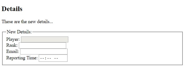 <!DOCTYPE html> <html> <body> <h2>Details</h2> <form> <p>These are the new details...</p> <fieldset> <legend>New Details:</legend> Player: <input type="text" disabled><br> Rank: <input type="number"><br> Email: <input type="email"><br> Reporting Time: <input type="time"> </fieldset> </form> </body> </html>