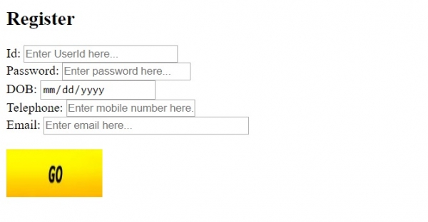 <!DOCTYPE html> <html> <body> <h2>Register</h2> <form action="" method="get"> Id − <input type="text" name="id" placeholder="Enter UserId here..." size = "25"><br> Password − <input type="password" name="pwd" placeholder="Enter password here..."><br> DOB − <input type="date" name="dob"><br> Telephone − <input type="tel" name="tel" placeholder="Enter mobile number here..."><br> Email − <input type="email" name="email" placeholder="Enter email here..." size = "35"><br><br> <input type="image" src="go.jpg" alt="Submit" width="120" height="60"> </form> </body> </html>