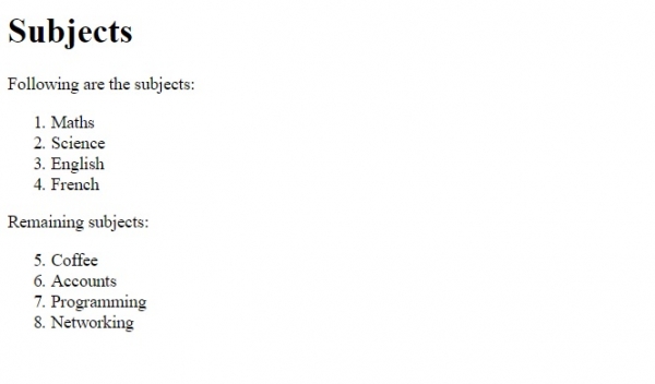 <!DOCTYPE html> <html> <body> <h1>Subjects</h1> <p>Following are the subjects −</p> <ol> <li>Maths</li> <li>Science</li> <li>English</li> <li>French</li> </ol> <p>Remaining subjects −</p> <ol> <li value="5">Coffee</li> <li>Accounts</li> <li>Programming</li> <li>Networking</li> </ol> </body> </html>