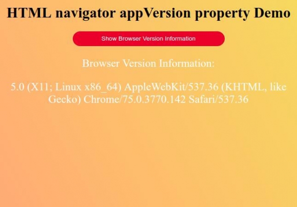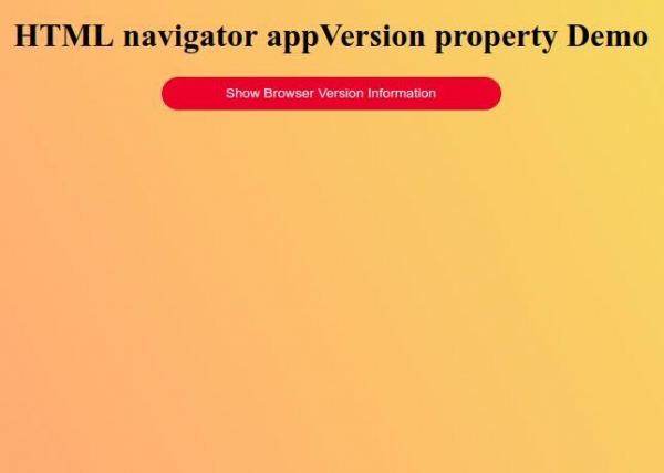 <!DOCTYPE html> <html> <style> body { color: #000; height: 100vh; background: linear-gradient(62deg, #FBAB7E 0%, #F7CE68 100%) no-repeat; text-align: center; } .btn { background: #db133a; border: none; height: 2rem; border-radius: 20px; width: 330px; display: block; color: #fff; outline: none; cursor: pointer; margin: 1rem auto; } .show { font-size: 1.5rem; color: #fff; } </style> <body> <h1>HTML navigator appVersion property Demo</h1> <button class="btn" onclick="display()">Show Browser Version Information</button> <div class="show"></div> <script> function display() { document.querySelector(".show").innerHTML = "<p>Browser Version Information:</p>" + "<p>" + navigator.appVersion + "</p>"; } </script> </body> </html>