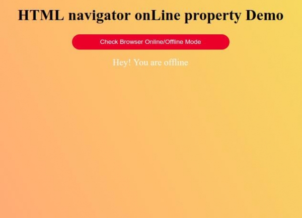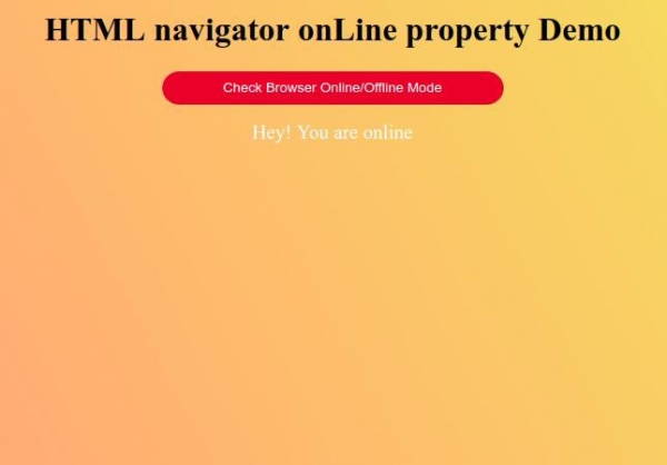 <!DOCTYPE html> <html> <style> body { color: #000; height: 100vh; background: linear-gradient(62deg, #FBAB7E 0%, #F7CE68 100%) no-repeat; text-align: center; } .btn { background: #db133a; border: none; height: 2rem; border-radius: 20px; width: 330px; display: block; color: #fff; outline: none; cursor: pointer; margin: 1rem auto; } .show { font-size: 1.2rem; color: #fff; } </style> <body> <h1>HTML navigator onLine property Demo</h1> <button class="btn" onclick="display()">Check Browser Online/Offline Mode</button> <div class="show"></div> <script> function display() { var msg = document.querySelector(".show"); if (navigator.onLine) { msg.innerHTML = "Hey! You are online"; } else { msg.innerHTML = "Hey! You are offline"; } } </script> </body> </html>