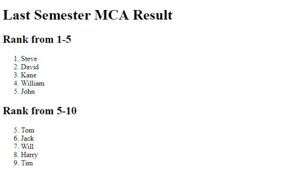 <!DOCTYPE html> <html> <body> <h1>Last Semester MCA Result</h1> <h2>Rank from 1-5</h2> <ol> <li>Steve</li> <li>David</li> <li>Kane</li> <li>William</li> <li>John</li> </ol> <h2>Rank from 5-10</h2> <ol start="5"> <li>Tom</li> <li>Jack</li> <li>Will</li> <li>Harry</li> <li>Tim</li> </ol> </body> </html>