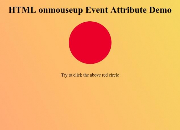 <!DOCTYPE html> <html> <head> <style> body { color: #000; height: 100vh; background-color: #FBAB7E; background-image: linear-gradient(62deg, #FBAB7E 0%, #F7CE68 100%); text-align: center; } .circle { background: #db133a; height: 150px; width: 150px; border-radius: 50%; margin: 10px auto; } p { margin: 30px auto; } </style> </head> <body> <h1>HTML onmouseup Event Attribute Demo</h1> <div class="circle" onmousedown="mouseDownFn()" onmouseup="mouseUpFn()"></div> <p>Try to click the above red circle</p> <script> function mouseDownFn() { document.querySelector('.circle').style.transform = 'scale(0.5)'; } function mouseUpFn() { document.querySelector('.circle').style.transform = 'scale(1.2)'; } </script> </body> </html>