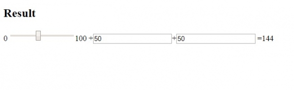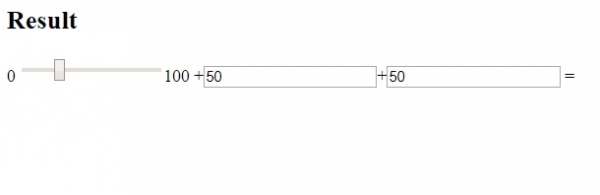 <!DOCTYPE html> <html> <body> <h2>Result</h2> <form oninput="n.value=parseInt(p.value)+parseInt(q.value)+parseInt(r.value)">0 <input type="range" id="p" value="25">100+<input type="number" id="q" value="50">+<input type="number" id="r" value="50"> =<output name="n" for="p q r"></output> </form> </body> </html>
