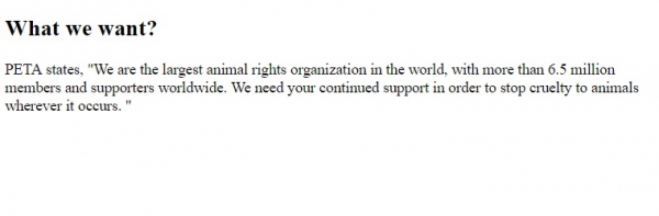 <!DOCTYPE html> <html> <body> <h2>What we want?</h2> <p>PETA states, <q cite="https://legacy.peta.org/why-give/">We are the largest animal rights organization in the world, with more than 6.5 million members and supporters worldwide. We need your continued support in order to stop cruelty to animals wherever it occurs.</q> </p> </body> </html>