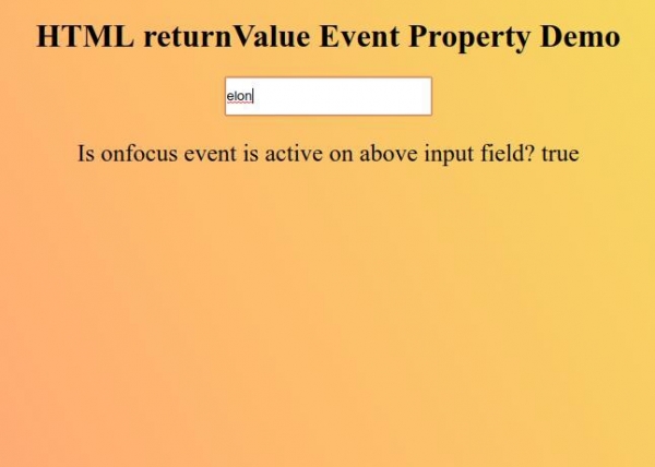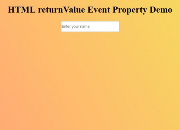 現在嘗試在輸入框中輸入值,使其獲得焦點,以顯示 returnValue 事件屬性的值。