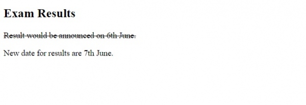 <!DOCTYPE html> <html> <body> <h2>Exam Results</h2> <p><s>Result would be announced on 6th June.</s></p> <p>New date for results are 7th June.</p> </body> </html>