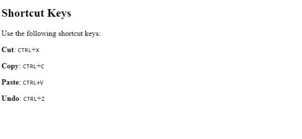 <!DOCTYPE html> <html> <body> <h2>Shortcut Keys</h2> <p>Use the following shortcut keys:</p> <p><strong>Cut</strong>: <tt>CTRL</tt>+<tt>X</tt></p> <p><strong>Copy</strong>: <tt>CTRL</tt>+<tt>C</tt></p> <p><strong>Paste</strong>: <kbd>CTRL</tt>+<tt>V</tt></p> <p><strong>Undo</strong>: <tt>CTRL</tt>+<tt>Z</tt></p> </body> </html>
