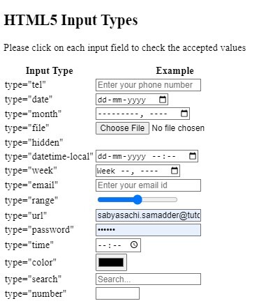 <!DOCTYPE html> <html> <head> <title>HTML5 Input Types</title> </head> <body> <h2>HTML5 Input Types</h2> <p>Please click on each input field to check the accepted values</p> <table> <tr> <th>Input Type</th> <th>Example</th> </tr> <tr> <td>type="tel"</td> <td><input type="tel" name="phone" placeholder="Enter your phone number"></td> </tr> <tr> <td>type="date"</td> <td><input type="date" name="birthday"></td> </tr> <tr> <td>type="month"</td> <td><input type="month" name="expiration_date"></td> </tr> <tr> <td>type="file"</td> <td><input type="file" name="curriculum vitae" accept=".pdf, .doc"></td> </tr> <tr> <td>type="hidden"</td> <td><input type="hidden" name="customer_id" value="1234"></td> </tr> <tr> <td>type="datetime-local"</td> <td><input type="datetime-local" id="interview" name="interview"></td> </tr> <tr> <td>type="week"</td> <td><input type="week" name="schedule_week"></td> </tr> <tr> <td>type="email"</td> <td><input type="email" name="email" placeholder="Enter your email id"></td> </tr> <tr> <td>type="range"</td> <td><input type="range" name="volume" min="1" max="100"></td> </tr> <tr> <td>type="url"</td> <td><input type="url" name="website" placeholder="Enter your website url"></td> </tr> <tr> <td>type="password"</td> <td><input type="password" name="password" placeholder="Enter your password"></td> </tr> <tr> <td>type="time"</td> <td><input type="time" name="interview_time"></td> </tr> <tr> <td>type="color"</td> <td><input type="color" name="favcolor"></td> </tr> <tr> <td>type="search"</td> <td><input type="search" name="search" placeholder="Search..."></td> </tr> <tr> <td>type="number"</td> <td><input type="number" name="quantity" min="1" max="100"></td> </tr> </body> </html>
