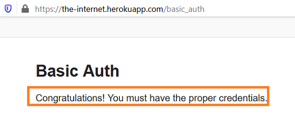 一旦正確輸入了使用者名稱和密碼,並且單擊了確定按鈕,我們應該被導航到帶有文字恭喜!您必須擁有適當的憑據的實際頁面。