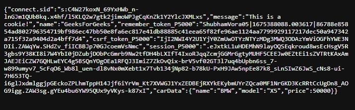 let express = require("express"); let cookieParser = require("cookie-parser"); //setup express app let app = express(); app.use(cookieParser()); //basic route for homepage app.get("/", (req, res) => { res.send("Express app is created successfully, and you are on homepage"); }); // create a JSON object to store car data let car = { name: "BMW", model: "X5", price: 50000, }; // route to set car object as cookie app.get("/setcar", (req, res) => { res.cookie("carData", car); res.send("car data is stored in cookies"); }); // route to get car object from cookies app.get("/getcar", (req, res) => { res.send(req.cookies); }); // route to clear car object from cookies app.get("/clear", (req, res) => { res.clearCookie("carData"); res.send("Cookies are cleared!"); }); //server listens to port 3000 app.listen(8000, (err) => { if (err) throw err; console.log("listening on port 8000"); });