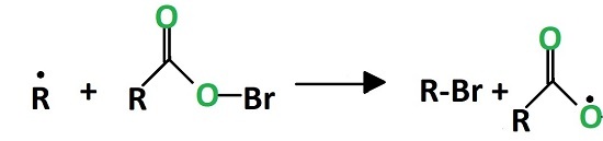 獲得的烷基自由基進一步與另一個**次溴酸醯**反應,導致形成烷基鹵化物。反應為: