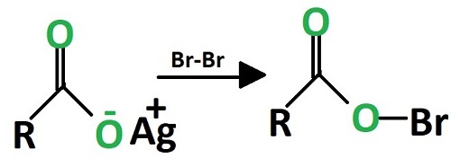 該反應的第一步涉及透過羧酸與溴反應形成**次溴酸醯**。反應為: