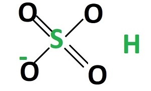 **硫酸氫根**包含一個硫原子、四個氧原子和一個氫離子。**硫酸氫根**的結構與甲烷分子類似,為四面體結構,結構如下: