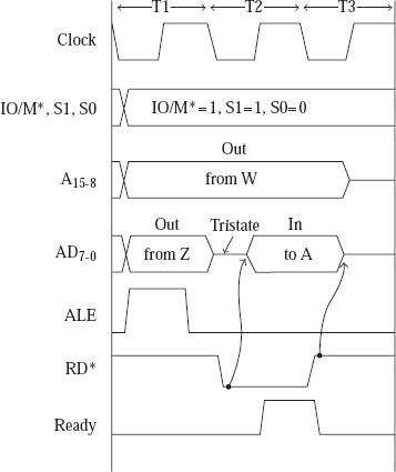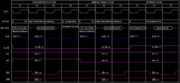 IN 35H 指令最後階段的三個時鐘週期是 IOR 機器週期的示例。IOR 機器週期的波形如下圖所示。