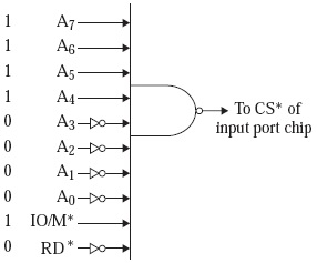 所有這些位將透過一個與非門,以產生輸出邏輯 1 作為晶片選擇 (CS),因此輸入埠晶片被選中。因此,當 8085 發出地址 F0H、IO/M* 為 1 和 RD* 為 0 時,晶片將響應。換句話說,我們認為它具有輸入埠號 F0H。