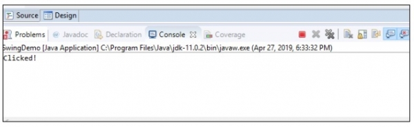 import java.awt.event.ActionEvent; import java.awt.event.ActionListener; import javax.swing.JButton; import javax.swing.JOptionPane; public class SwingDemo { public static void main(final String args[]) { JButton btn = new JButton("DemoButton"); btn.addActionListener(new ClickListener()); JOptionPane.showMessageDialog(null, btn); btn.doClick(); } } class ClickListener implements ActionListener { public void actionPerformed(ActionEvent e) { System.out.println("Clicked!"); } }