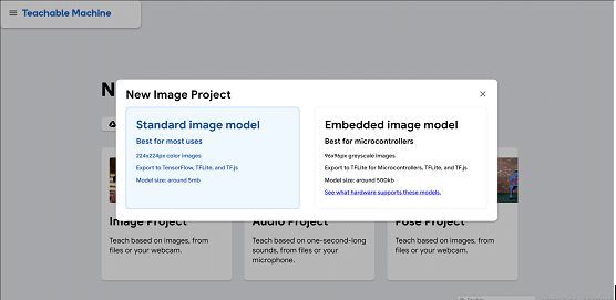 執行此步驟後,將開啟一個新視窗,其中將顯示三種專案型別:影像專案、音訊專案和姿勢專案。因此,我們想要建立影像分類模型,因此我們將選擇“影像專案”選項。它會詢問我們是否要使用標準影像模型或嵌入式影像模型,因此我們將選擇“標準影像模型”。此處,標準影像模型將建立 TensorFlow 和移動機器學習模型,而嵌入式模型將建立嵌入式系統(如微控制器)的模型。