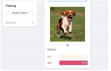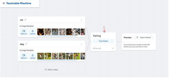 現在,我們將使用“訓練模型”按鈕開始基於提供的影像訓練模型。Teachable Machine 將自動生成模型。當我們從訓練選項中選擇“高階”下拉選單時,我們也可以單擊並自定義訓練要求,然後它將要求自定義“週期”、“批次大小”和“學習率”。