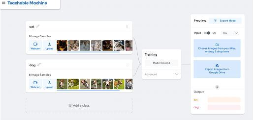 在這裡,我們建立了“貓”和“狗”類別,您也可以根據需要新增更多類別。現在,我們將為此模型提供可訓練的影像。對於此模型,我透過瀏覽網站儲存了一些貓和狗的影像,並將其儲存在我的本地計算機的不同資料夾中。