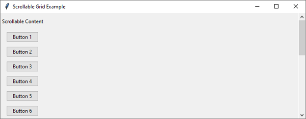 以上程式碼建立了一個簡單的 Tkinter 視窗,其中包含一個可滾動的網格佈局,其中包含標籤和按鈕。