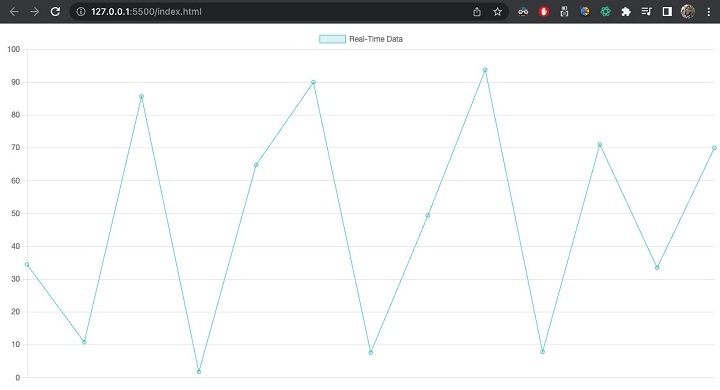 為了模擬即時資料更新,我們使用 setInterval() 每秒執行一次函式。在函式內部,我們出於演示目的生成時間戳和隨機資料。然後,我們將時間戳和資料推送到圖表資料物件的相應陣列中,並呼叫 update() 方法以使用新資料重新繪製圖表。