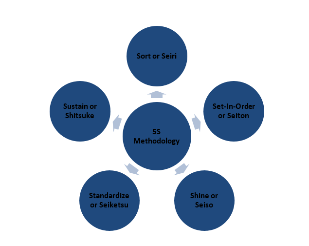 5S方法基於五個以“S”開頭的日語詞彙。它們很容易記住,因為它們的英文版本也以“S”開頭。日語中分別是整理(Seiri)、整頓(Seiton)、清掃(Seisou)、清潔(Seiketsu)和素養(Shitsuke)。在英語中,它們分別被稱為 -