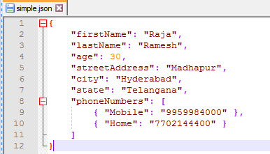 {"firstName":"Raja","lastName":"Ramesh","streetAddress":"Madhapur","city":"Hyderabad","state":"Telangana","phoneNumbers":[{"Mobile":"9959984000"},{"Home":"7702144400"}],"postalCode":"500072"}