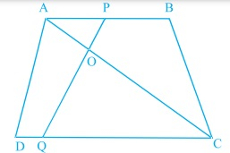 在下圖中,如果\( \mathrm{AB} \| \mathrm{DC} \) 且\( \mathrm{AC} \) 和\( \mathrm{PQ} \) 相交於點\( \mathrm{O} \),證明\( \mathrm{OA} \cdot \mathrm{CQ}=\mathrm{OC} \cdot \mathrm{AP} \)。