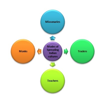 印度的文化和傳統在很長一段時間內傳播到亞洲各國。這最初是由商人開始的,後來由印度和亞洲國家的僧侶、傳教士和教師推動。印度的豐富文化和佛教傳播到了這些亞洲國家。這些亞洲國家的文化在印度文化和傳統的薰陶下蓬勃發展並變得更加豐富。