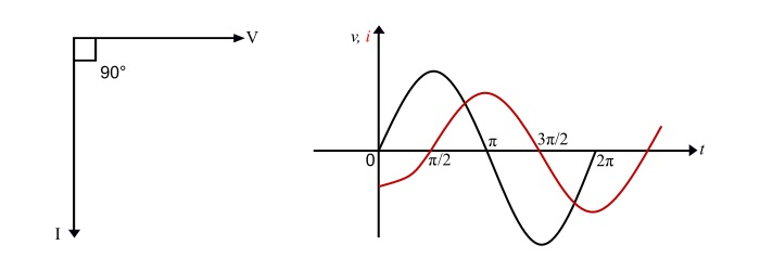 從公式 (5) 可以看出,純電感上的電流滯後於電感上的電壓 90°。它也可以用相量圖和波形表示為: