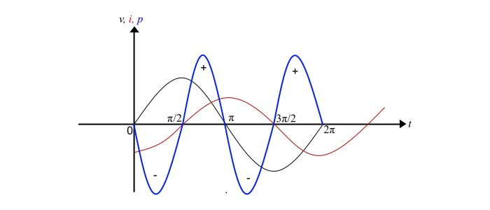 $$\mathrm{p=\frac{1}{2\pi}\int_{0}^{2\pi}-\frac{V_{m}\:I_{m}}{2}sin\:2\omega t\:d\omega t}\:\:\:… (8)$$