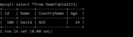 +------+-------+-------------+------+ | Id | Name | CountryName | Age | +------+-------+-------------+------+ | 100 | David |AUS | 24 | +------+-------+-------------+------+ 1 row in set (0.00 sec)